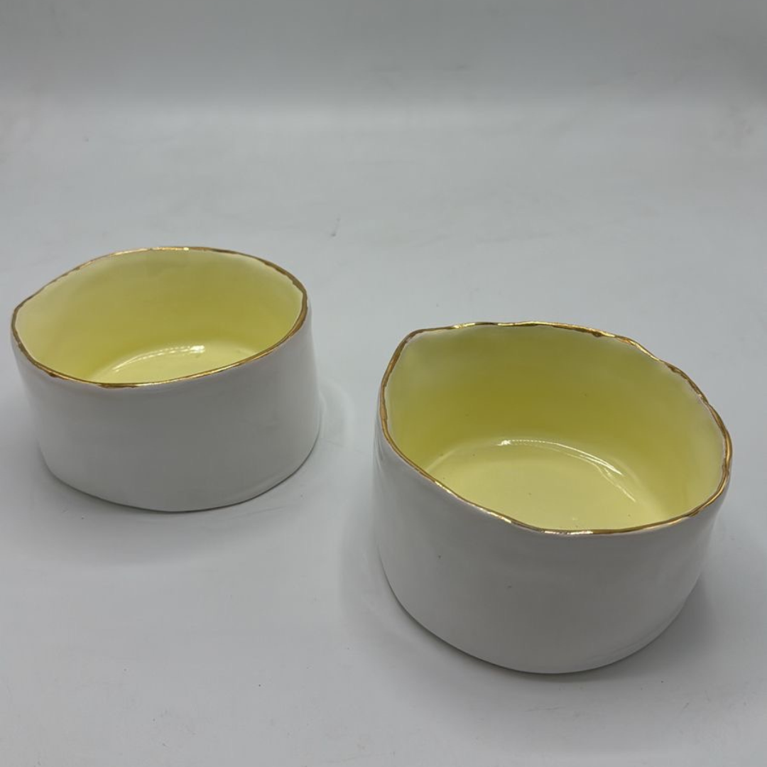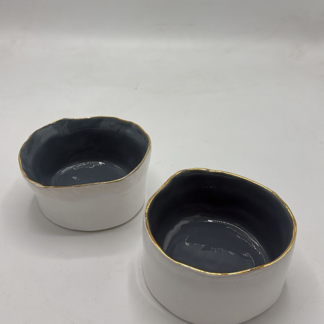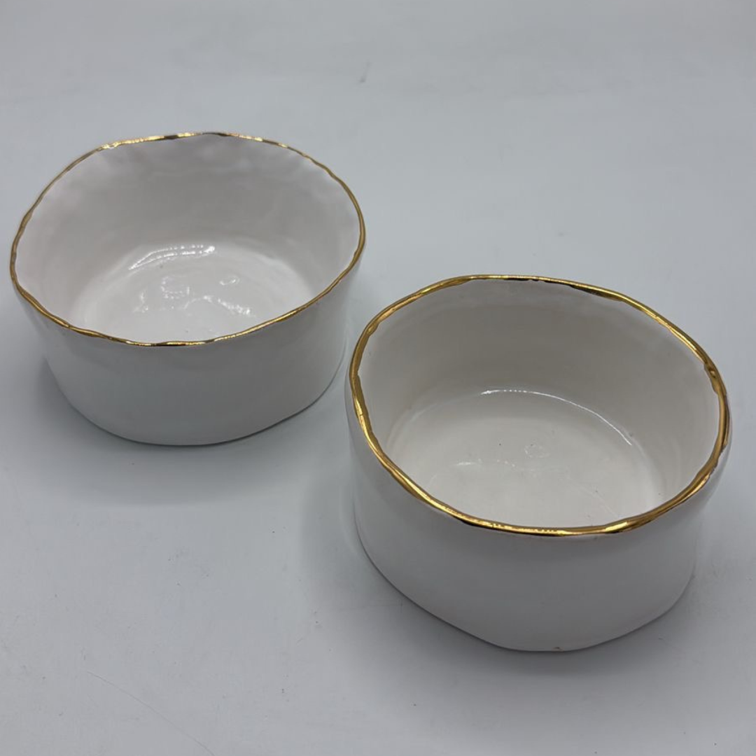Set of 2 organic colored handmade ceramic nut bowls with gold rim.