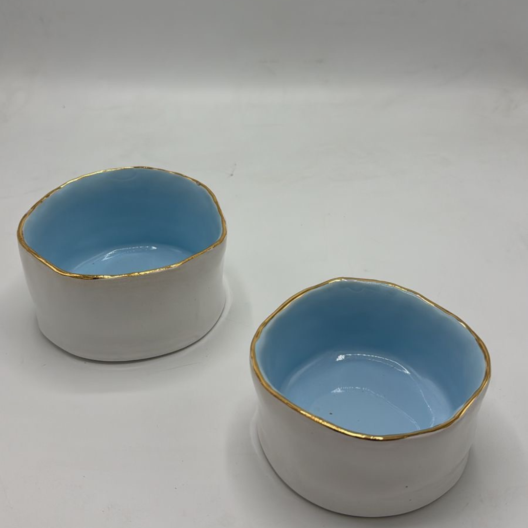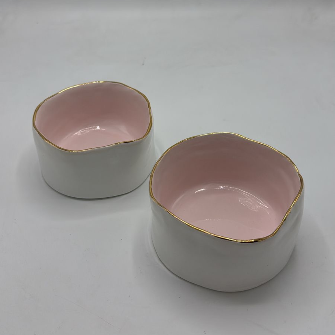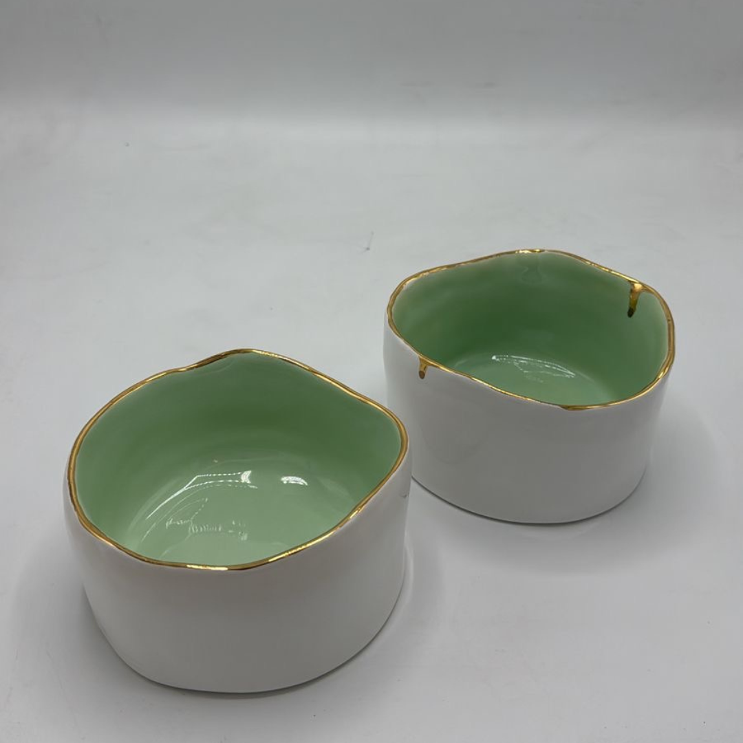 Set of 2 organic colored handmade ceramic nut bowls with gold rim.