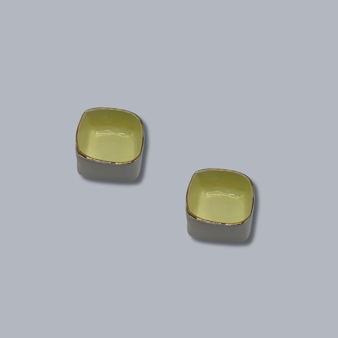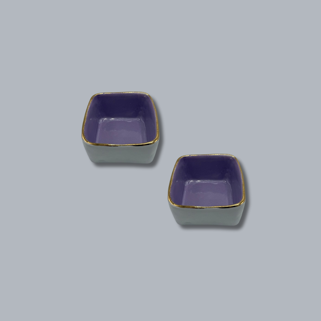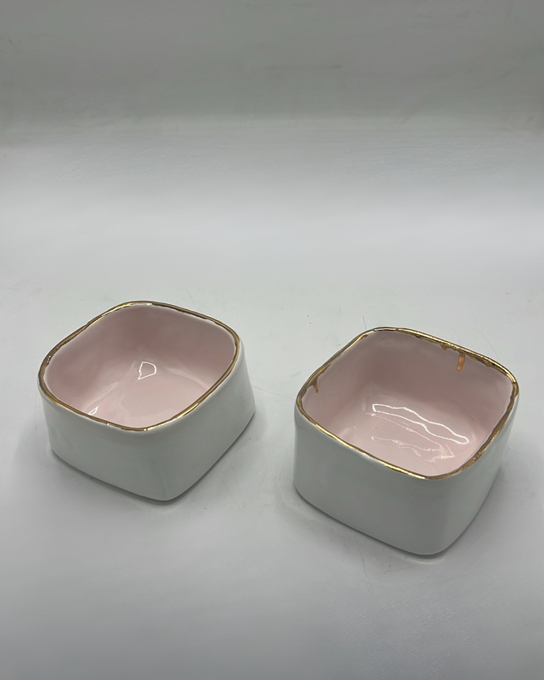 Set of 2 organic colored handmade square ceramic nut bowls with gold rim.