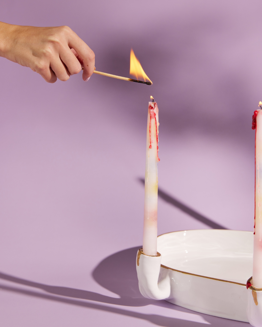 Ceramic oval serving dish with gold or silver rim and 3 candle holders attached to its sides.