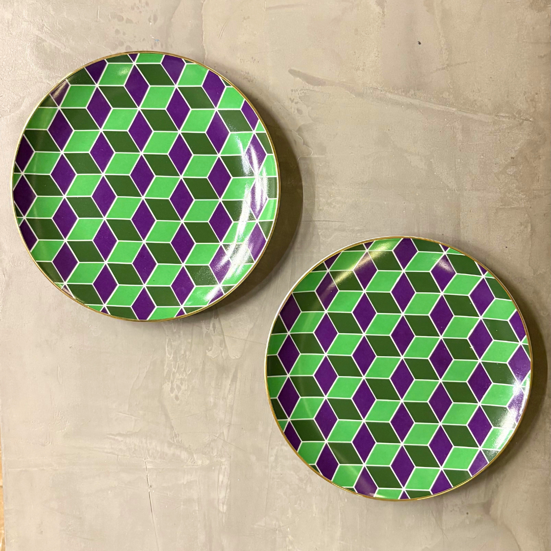 Each set includes three distinct colorways, with two plates of each design and a golden rim.