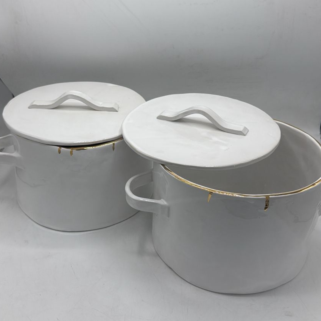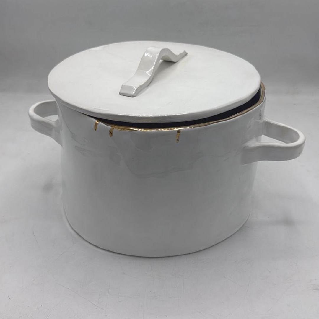 White ceramic pot with gold dripping rim and linear cover