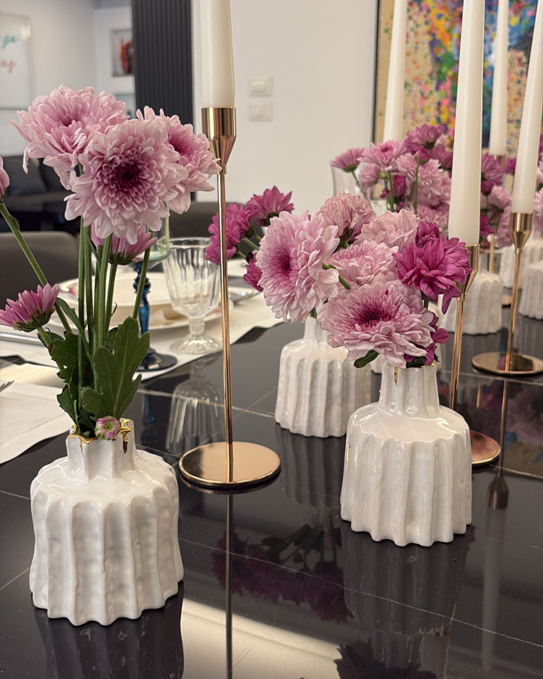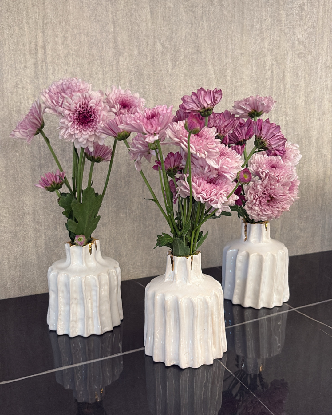 White ceramic mini vase with a gold-dripping edge, born from the collaboration between Edible Edges and Burn in 7uly.