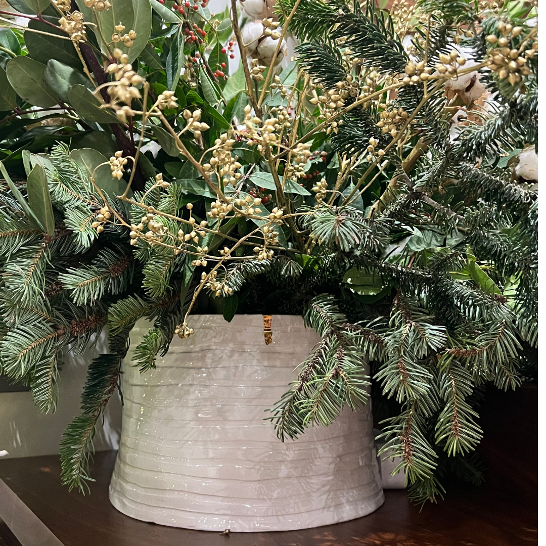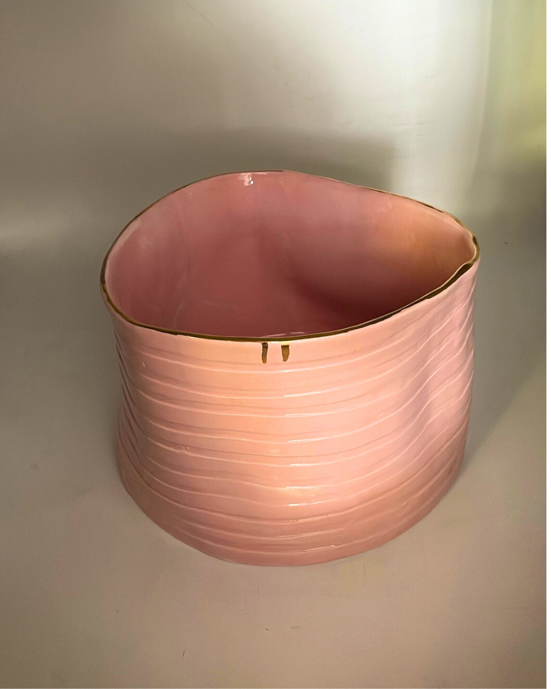 Handmade ribbed ceramic serving bowl with gold dripping rim, can also be used as a vase.