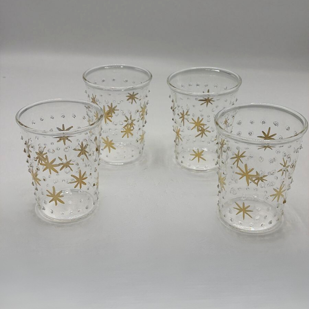 Set of 6 handblown glass cups with clear dots & hand-engraved gold stars. Suitable for serving water, juice or any chilled beverage.